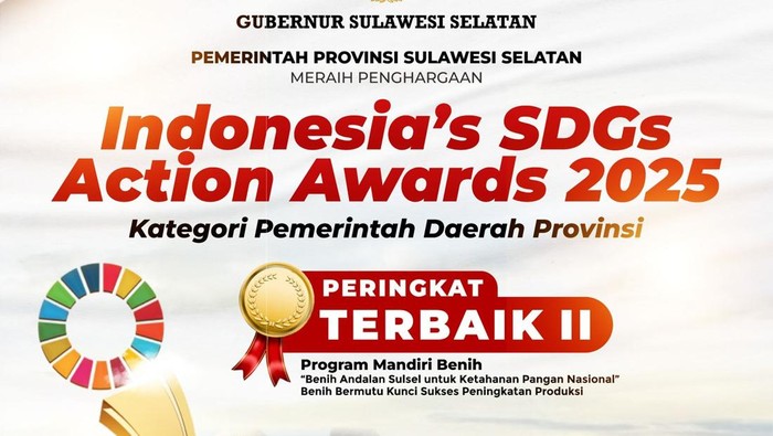 “Alhamdulillah, Pemerintah Provinsi Sulawesi Selatan mendapatkan penghargaan Indonesia’s SDGs Action Awards 2025 sebagai Peringkat Terbaik II Kategori Pemerintah Daerah Provinsi untuk Program Mandiri Benih. Terima kasih kepada Kementerian PPN/Bappenas serta UN Resident Coordinator atas apresiasi ini,” ujar Andi Sudirman dalam keterangannya, Kamis (20/11/2025).