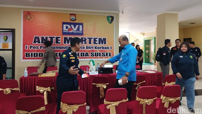 Haeru datang untuk memastikan kegiatan pengumpulan data diri korban oleh keluarga. Dia memastikan beberapa hal dan menanyakan kelengkapan data yang dibutuhkan tim DVI Polda Sulsel.