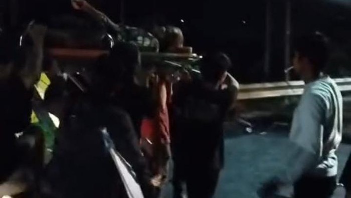 Terlihat pula, lansia tersebut ditandu melewati ban terbakar dan pohon tumbang. Lansia tersebut kemudian dipindahkan ke ambulans untuk melanjutkan perjalanan ke rumah sakit.