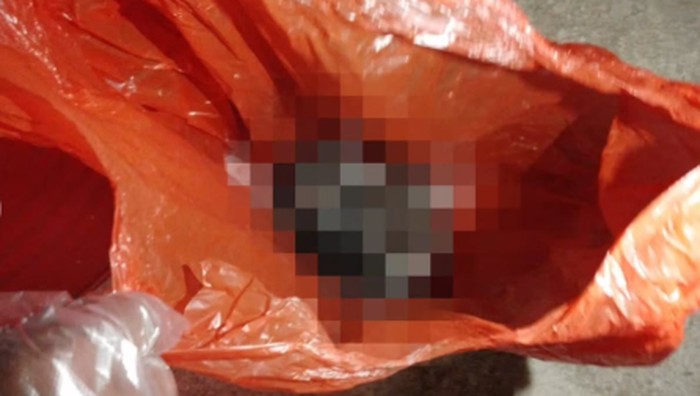 Kepala kambing itu dibungkus kantong plastik berwarna merah. Polisi bersama pemilik warung lalu membuang kepala kambing tersebut ke tempat sampah.