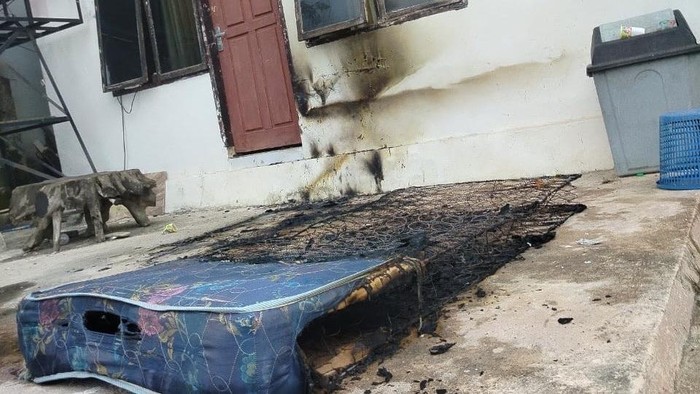 Setibanya di rumah, korban mendapati bantal terbakar di dapur serta sebuah springbed yang sudah terbakar di teras rumah. Warga setempat sempat terlibat tarik-menarik dengan pelaku untuk menjauhkan springbed dari tembok rumah.