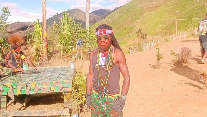 Dari foto yang dirilis TNI, tampak pelaku berada di wilayah pegunungan. Mayu Walia tampak berdiri ketika difoto dengan mengenakan kacamata dan atribut bintang kejora di kepala.